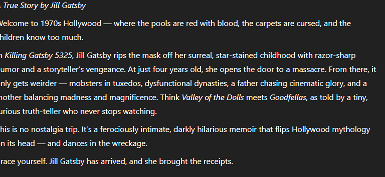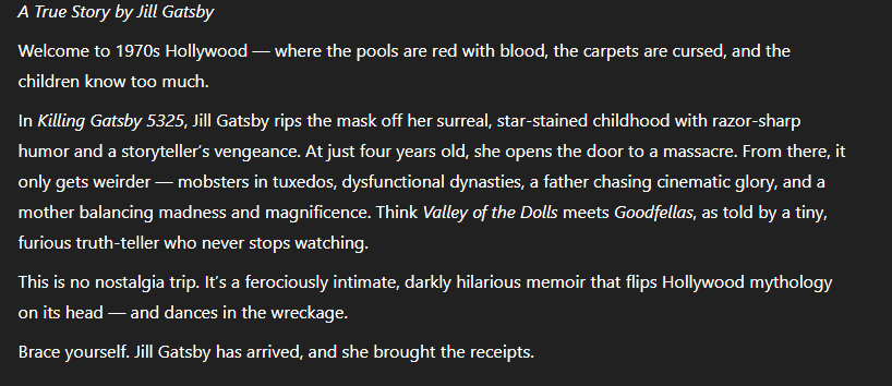 J. Gatsby is the author of KILLING GATSBY, a graphic memoir and multimedia project that dismantles Hollywood mythology through personal history, satire, and visual storytelling. Gatsby is a filmmaker, writer, producer, and actor whose work spans film, theater, and transmedia storytelling. They trained for over twenty years with legendary acting teacher Sanford Meisner, developing a performance style rooted in emotional truth, precision, and psychological realism.